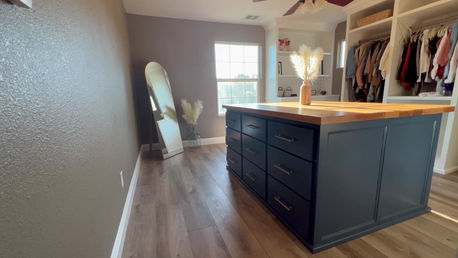 This custom closet features an extra large island that provides ample storage and a luxurious feel. We also incorporated warm colors with pops of gold throughout the space, which adds a touch of elegance and sophistication. I worked closely with contractors overall creating a closet that is not only functional but also a true statement piece.